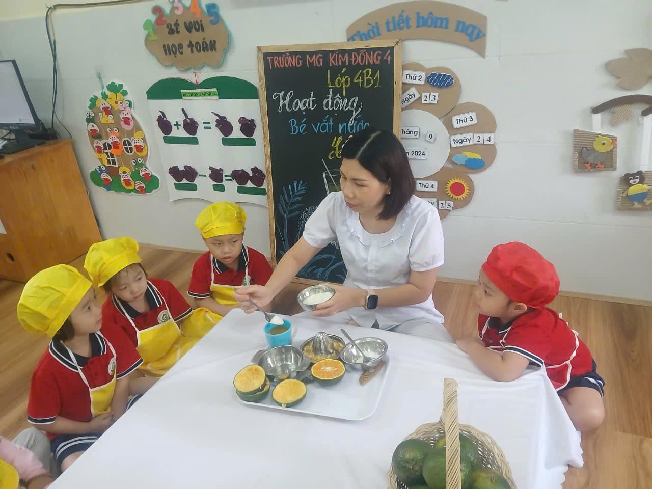 🥤🍊 Cô đã cắt đôi quả cam giúp bé rồi. Nào! chúng mình cùng vào việc thôi.
